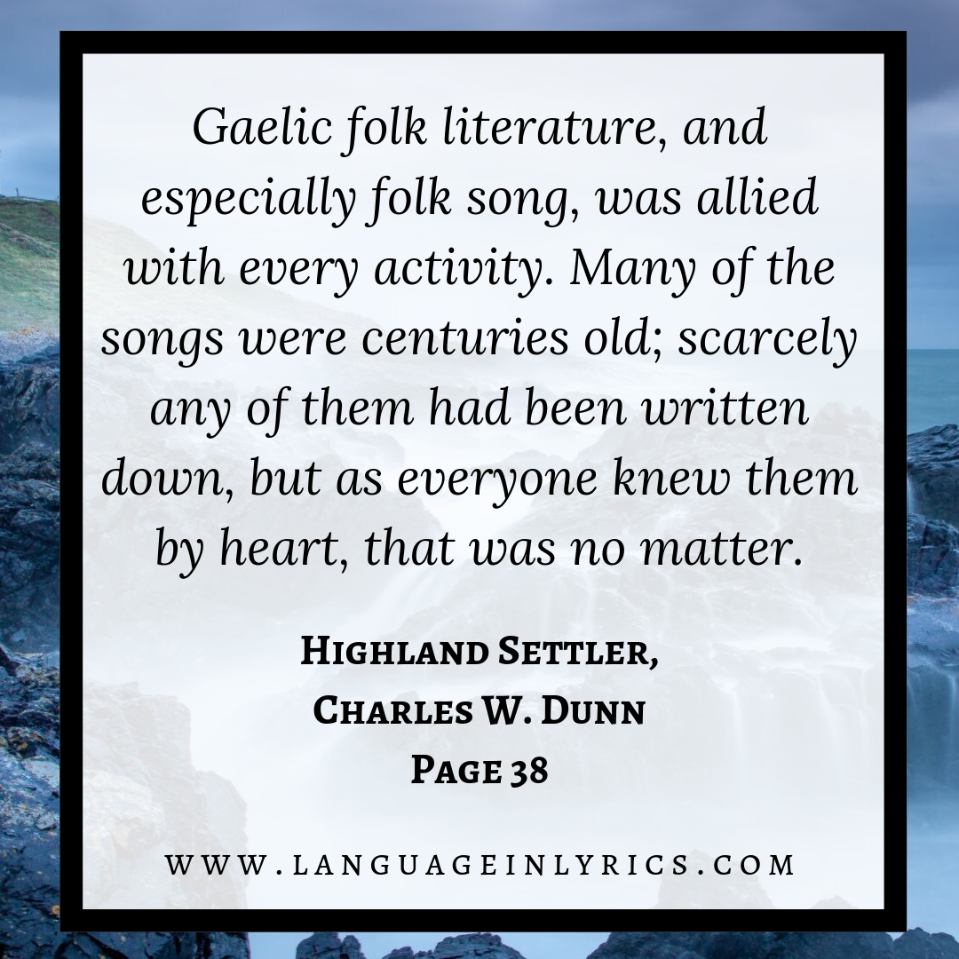 What was slightly unexpected to me was just how much I would learn through gathering quotes and idioms to create graphics with. Spending quieter days reading excerpts pertaining to the history and customs of various time periods, despite not always being related to specific songs or communities, provided depth and context to the entirety of the work I had been doing. At the same time I was unintentionally gaining knowledge about my own personal interests. It was through this process that I was able to learn more about Òrain Leannachd (Courtship Songs) and the true (often humorous) character of how they functioned at the milling table in the North Shore, a concept that I had previously heard of only in passing. I also had the pleasure of happening upon many other anecdotes that revealed much about the history of my people and my home, including one involving a man who had composed songs about his experience staying in Sydney upon arrival from North Uist. This was something small yet so personally significant to me as someone with North Uist roots hailing from Glace Bay.