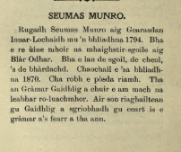 On page 36 A. MacLean Sinclair writes…“Seumas Munro was born at Fort Inverlochy(?) around the year 1794. He was a school master for a long time at Blàr Odhar. He was educated, and full of music and poetry. He died in 1870. He was never married. The Gaelic Grammar that he put out is extremely valuable. For rules of writing Gaelic correctly it is the best one there is.”