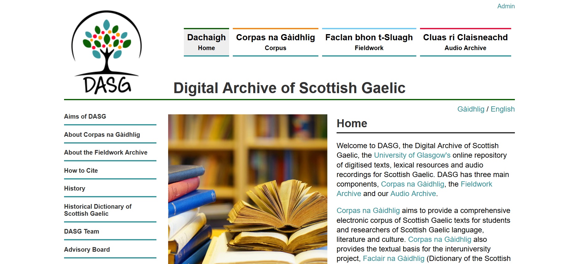 Like Tobar an Dualchais, the Digital Archive of Scottish Gaelic (DASG) is a pillar of the online Gaelic community. The Archive is a joint effort between the University of Glasgow and Sabhal Mòr Ostaig on the Isle of Skye. DASG is organized into three main categories, or online exhibits, all on the top of the main homepage: Corpus na Gàidhlig (corpus), Faclan bhon t-Sluagh (fieldwork), and Cluas ri Claisneachd (audio archive). Corpus na Gàidhlig is a searchable database of Gaelic texts. Faclan bhon t-Sluagh, their fieldwork database, is a collection of documents and recordings which capture vernacular Gaelic vocabulary. Cluas ri Claisneachd, for its part, brings together five audio collections: the Historical Dictionary of Scottish Gaelic (HDSG), Mòthan, Guthan nan Eilean, Calum MacNìll, and Am Bàrd Bochd.