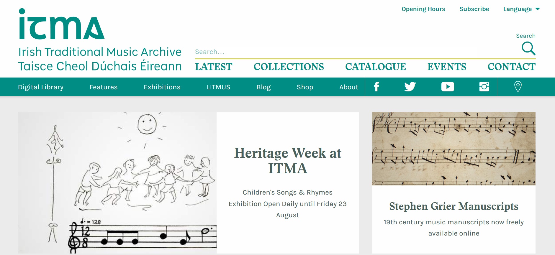 The Irish Traditional Music Archive is very unusual, in that the archive staff explain in detail how the site and database were built on its Digitisation page. ITMA has two sections that make up its online presence: it has an online library catalogue for its physical holdings, and a selection that are digitized and available in the Digital Library section. The library uses SoutronLMS as its OPAC system. On the other hand, the Digital Library runs on Craft Content Management System, which itself grew out of Expression Engine (remember content management systems from the last blogpost? We’ll talk more about them in a later blogpost).