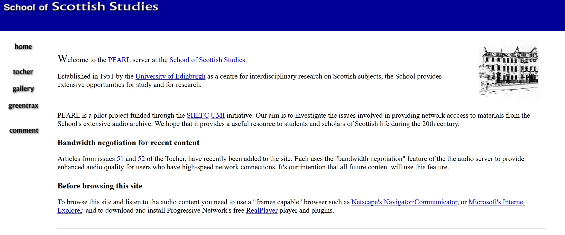Established in 1996, The Pearl Project is an initiative from the School of Scottish Studies at the University of Edinburgh. What may be of particular interest for you, if you’re already interested in Language in Lyrics is their audio archive, called Tocher (Gaelic for “dowry”). Tocher was first established in 1971. There, they have digitized transcriptions of text, music, and stories held in the School of Scottish Studies at the University of Edinburgh.