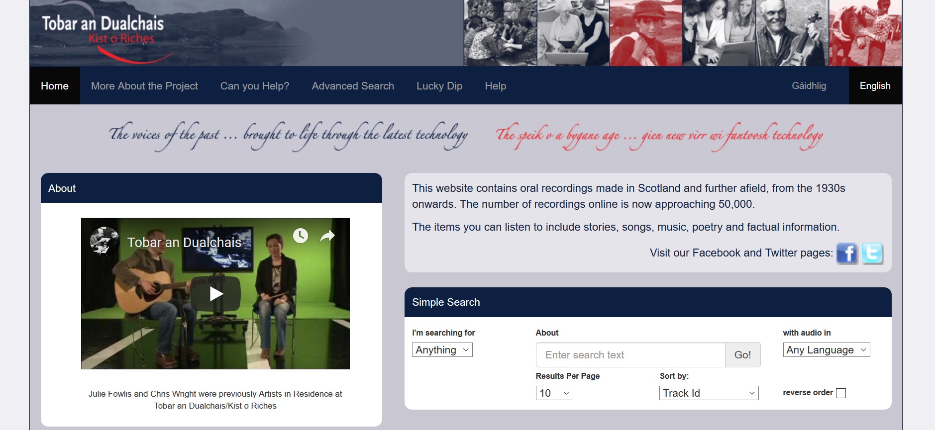 The Tobar an Dualchais website is built, like most modern websites, on a backend database that is invisible to the visitor, but allows complex search queries, a highly visual interface, and other functions. The site runs on a bespoke database built especially for their purposes. The site was redesigned and modernized in 2018 by EDINA, a “centre for digital expertise and online service delivery” out of the University of Edinburgh.
