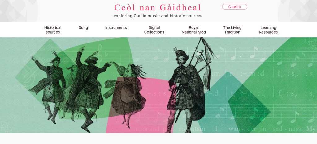 Ceòl nan Gàidheal is a digital resource from the National Library of Scotland. You can find it under the Digital Gallery page. The website draws from the Library’s own holdings to, as they describe on the homepage, “provide an initial insight into Gaelic music, its history, instruments and song, transmission methods and how the tradition is very much alive today.” The website has plenty of historical contextual information, as well as digitized music books, early examples of written Gaelic, and recordings from the Library’s collection. The textual sources are free to download for personal use – you can even download the entire book in some cases.
