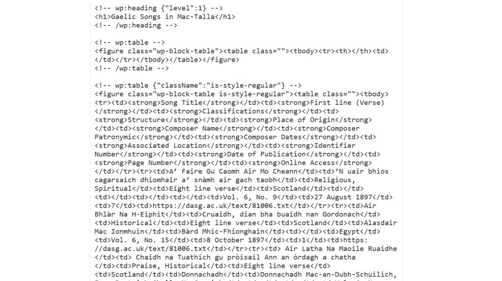 Maybe it was a glitch? So again, we coded 100 entries of the table line by line. We tried much more carefully this time to stay only within the HTML Editor view while working on all the other posts. Open the Mac-Talla draft page, and all the custom HTML is overwritten AGAIN. While the basic entries remained, all the formatting had been erased. Double ouch, lesson really learned that time.