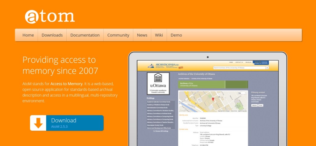 AtoM is short for Access to Memory. It was developed by Artefactual Systems. It’s Canadian, and it’s also free and open source. To “organize its fridge,” as it were, it uses standards-based archival description for its data fields. It’s very respected in Canadian digital humanities circles. Around this neck of the woods, it has some very high-profile users, including the Dalhousie Archives and MemoryNS.