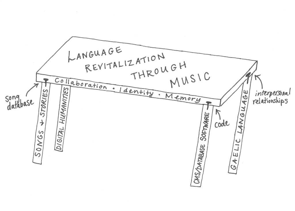What are the legs of our table? These are the base supports of the project: the Gaelic language, digital humanities theory, CMS/database software, and the songs and stories themselves.