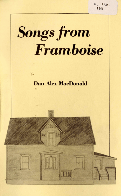 Other than Songs from Framboise, many of Dan Alex MacDonald’s songs are published in Beyond the Hebrides (Fergusson, 1977) and Gaelic Songs in Nova Scotia (Creighton, 1964). Further unpublished materials may be found in a fonds bearing his name at the Beaton Institute (MG 6.35).