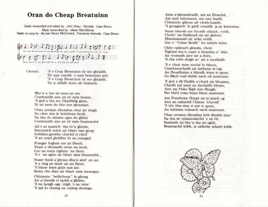 Dan Alex’s poetry deals with a number of common themes explored by many 20th century Nova Scotia bards, not least of which is the changing scene of rural Cape Breton. While growing up in Framboise certainly had its share of difficulty, MacDonald recalls fondly the simplicity and security of his youth. He praises the Gaelic cultural observances that punctuated the year and united the community. Also present in his compositions is his faith and participation in the local Protestant church. Probably his best known and widely sung composition would be Òran do Cheap Breatainn, or ‘S e Ceap Breatainn Tìr Mo Ghràidh as it is also known. The song is an ambitious 14-verse praise of Gaelic Cape Breton and the lifestyle he enjoyed in his youth.