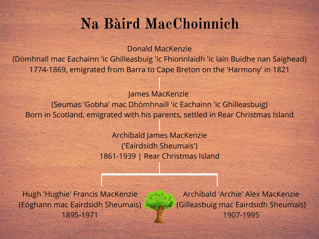 Eairdsidh Sheumais was descended from muinntir Bharraigh – Barra people – his father James (Seumas) having emigrated to Rear Christmas Island as a boy in 1821. Eairdsidh (1861-1939) went on to have ten children of his own, including brothers Hugh Francis (1895-1971) and Archibald Alex (1907-1995).