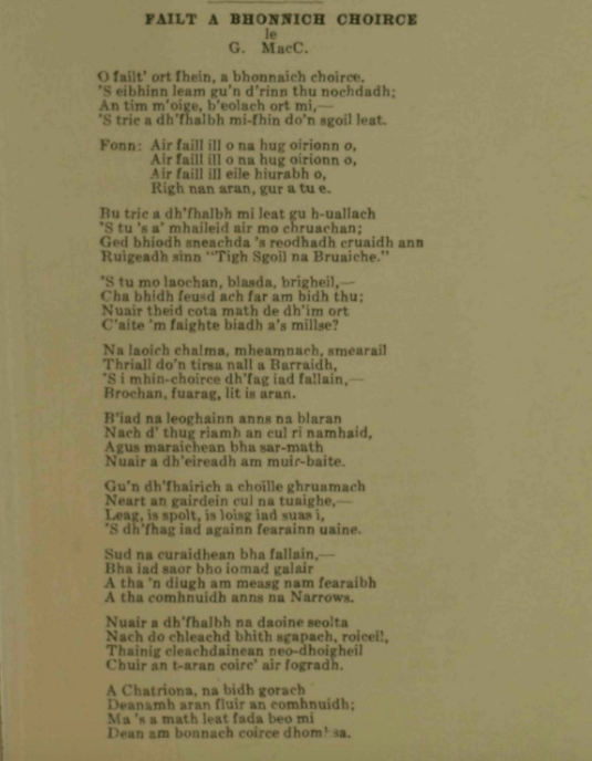 Fàilte a Bonnaich Choirce, composed by Eairdsidh Sheumais, p. 167 in the 1926 edition of a History of Christmas Island. A recording of the song is available on An Drochaid Eadarainn here.