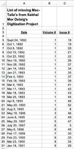 The full digitized texts of Mac-Talla are available here. There are 27 issues that have not been digitized and which we are currently trying to track down and scan. If anyone has any leads we would be grateful to hear them! Below are the missing issues: